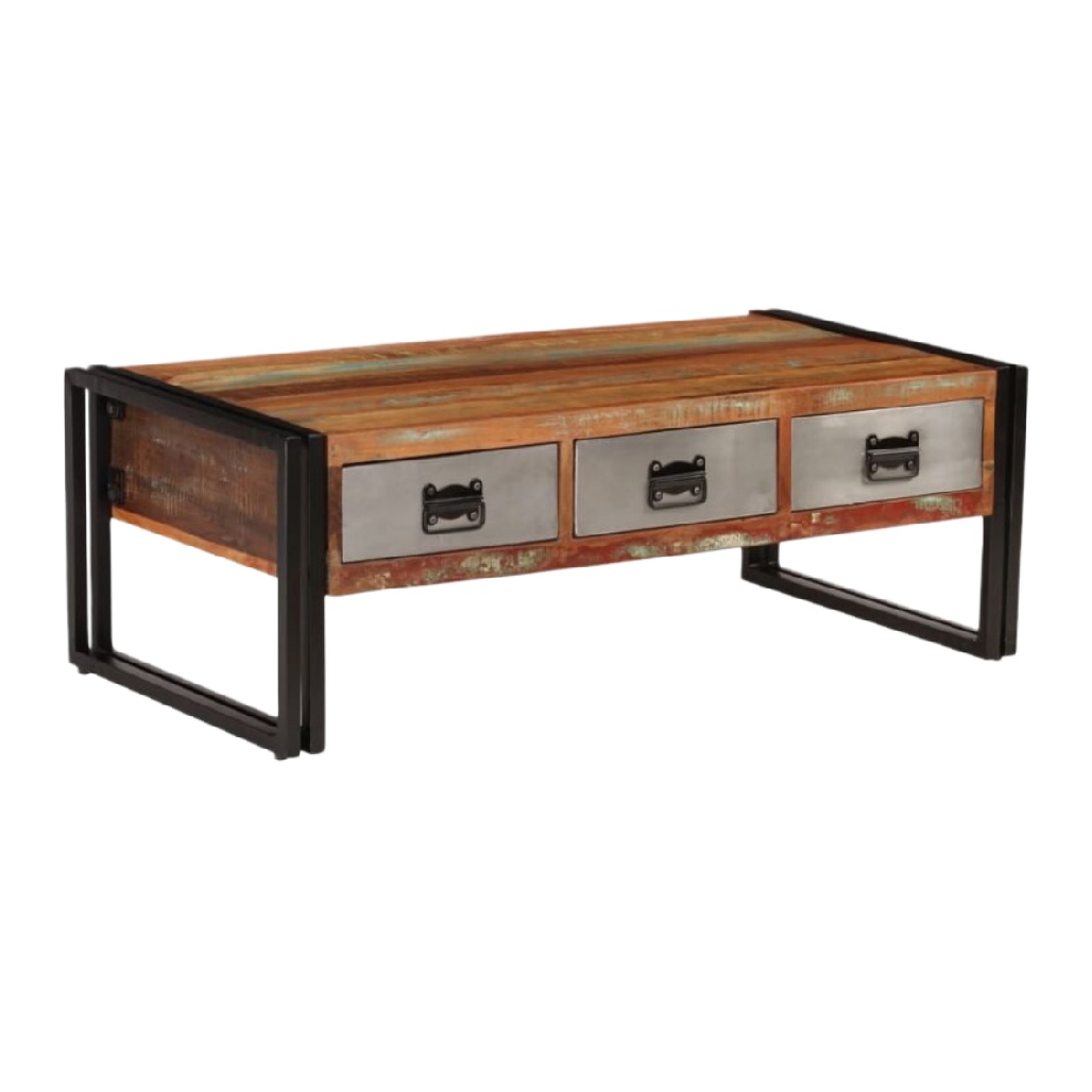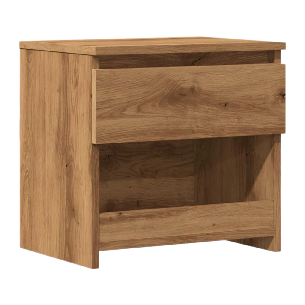 Table de chevet en bois naturel avec un tiroir et un espace de rangement ouvert.