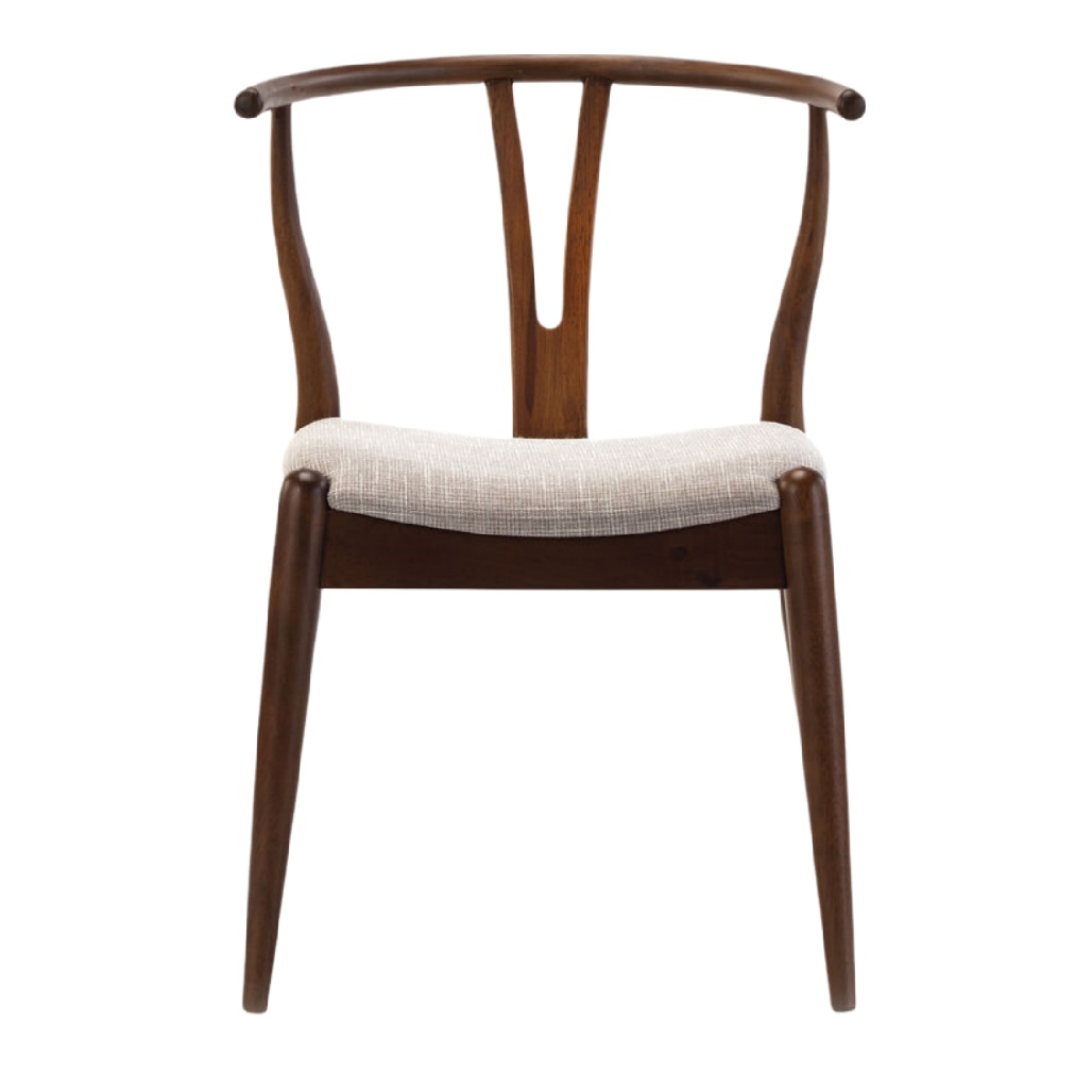 Chaise en bois à dossier en forme de V et coussin en lin beige
