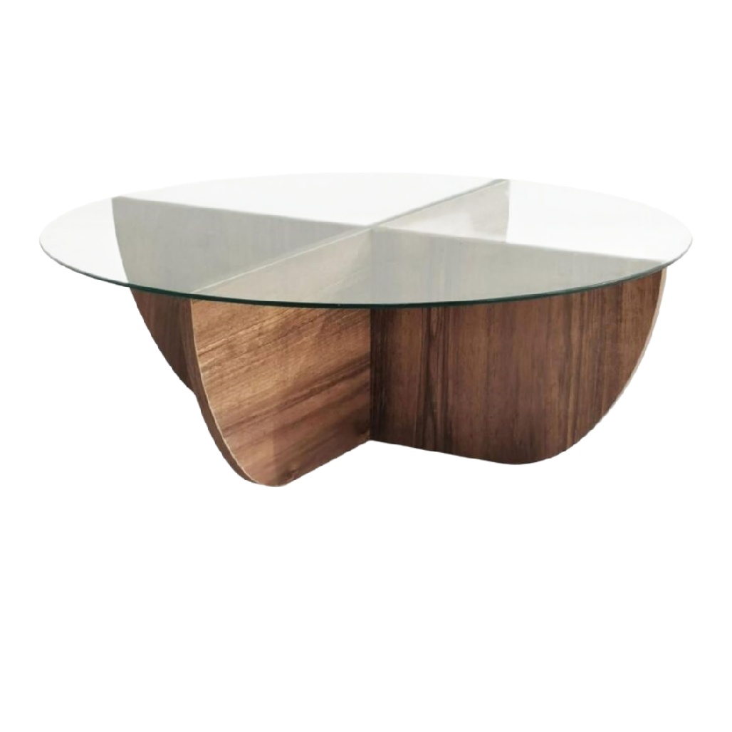 Table basse en verre et bois, design moderne, forme géométrique.